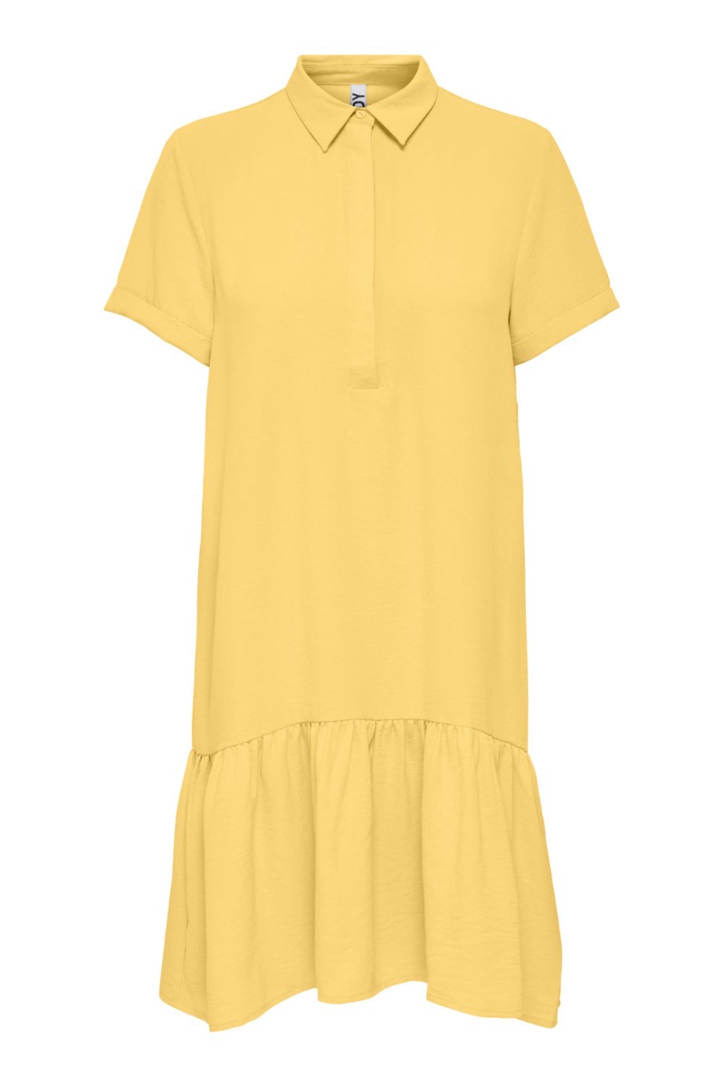 En rigtig fin kjole fra JDY i gul med peplum og skjortekrave med skjult knaplukning. Den er designet i en let kvalitet med korte t-shirtærmer og kan nemt bruges alene, med nylonstrømper eller jeans under.
