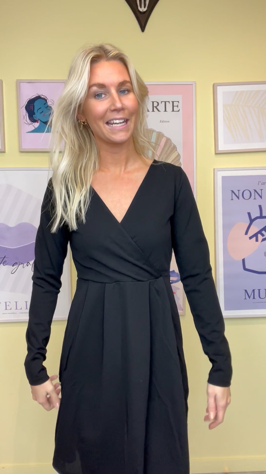 En smuk og simpel kjole fra JDY er kommet til dette efterår. Den er med slå-om effekt men er fastsyet og kan derfor ikke åbnes. Underdelen er A formet og har masser af vide så den falder smukt og løst på under kroppen. Den er fin sammen med en mønstret strømpebukser eller til en farvet strømpe i et par loafers.