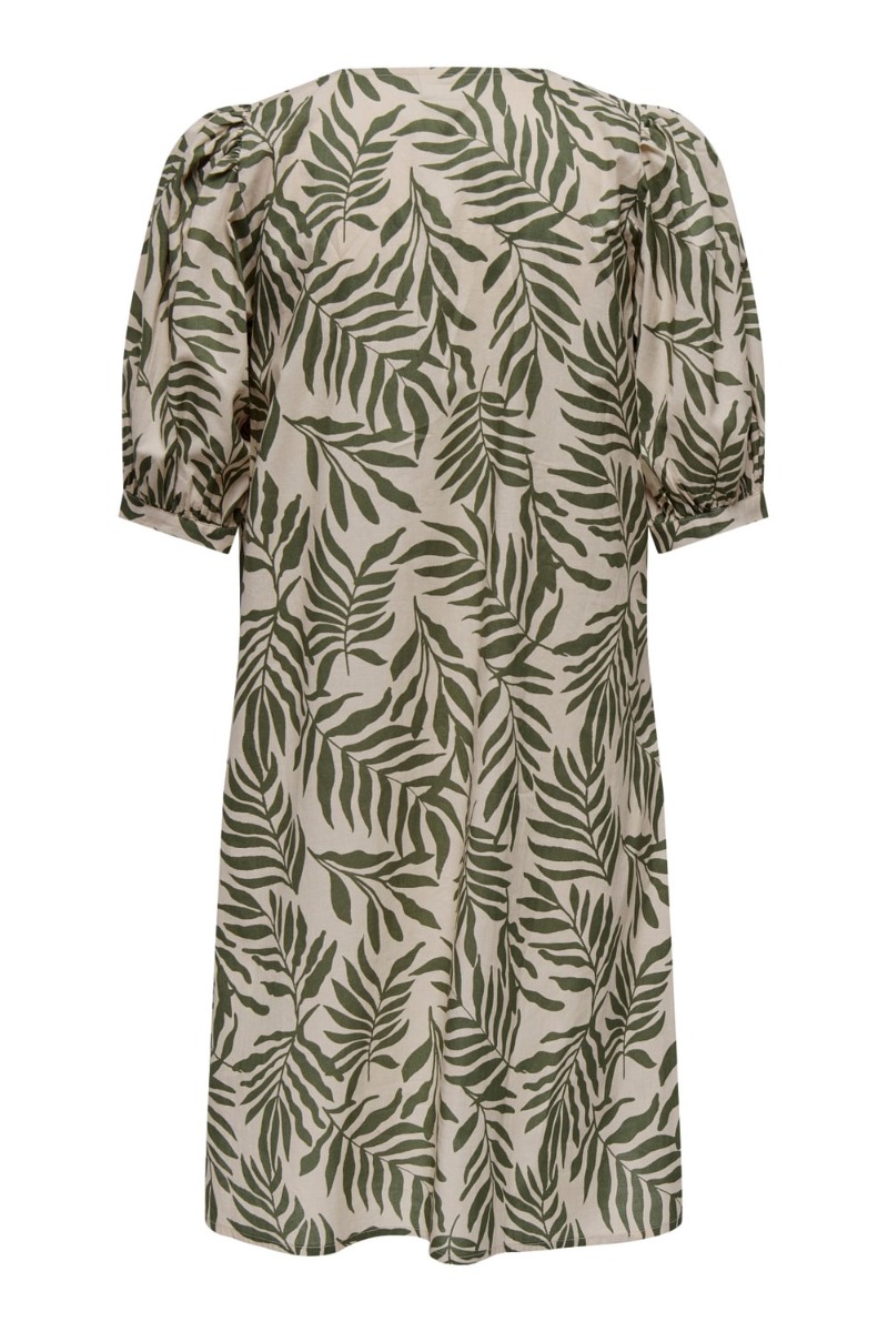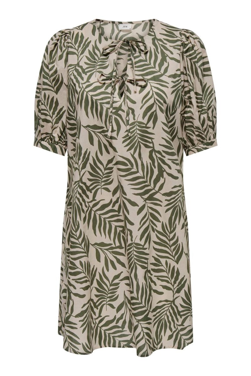 En fin kjole fra JDY i beige med grønt print i en løs pasform. Den er med smukke sløjfe detaljer ved brystet og har korte pufærmer. Derudover er den dejlig let i kvaliteten og kan nemt bruges til sommer.