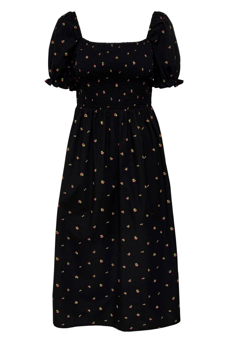 Sort kjole fra JDY med det fineste lille kirsebær mønster på. Kjolen har et løst snit med tætsiddende smockdetalje ved barmen der giver en firkantet udskæring. Den har korte pufærmer med en sød lille flæse i enden. Style den til en slippers eller sneaks alt efter vejret.