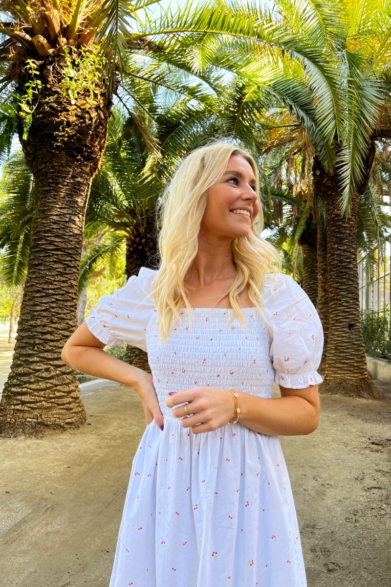 Iiiih, se lige den fineste søde kirsebær kjole fra JDY! Kjolen er hvid med små kirsebærprint, smock ved barmen og korte pufærmer med flæsekant. Kjolen har en feminin talje og falder løst nedefter. Style den med en stilet eller en sød sandal til de varme sommerdage.