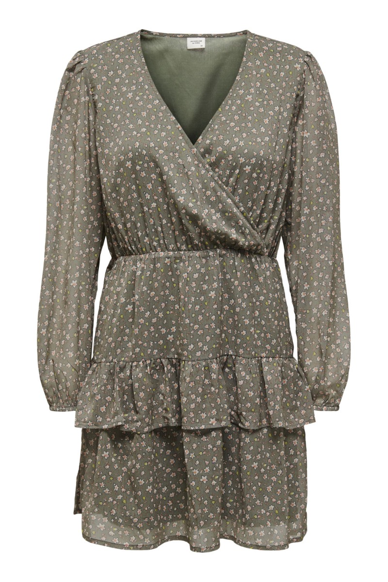 Sød blomsterkjole fra JDY. Bundfarven er army med blomsterprint i orange og gule nuancer. Modellen er løst siddende med elastikdetalje i livet der giver en feminin pasform. Foran går den ned i v-udskæring med cross-over-effekt. Ærmerne er transparente og afsluttes med elastik, der giver et lille løst ballon-snit.