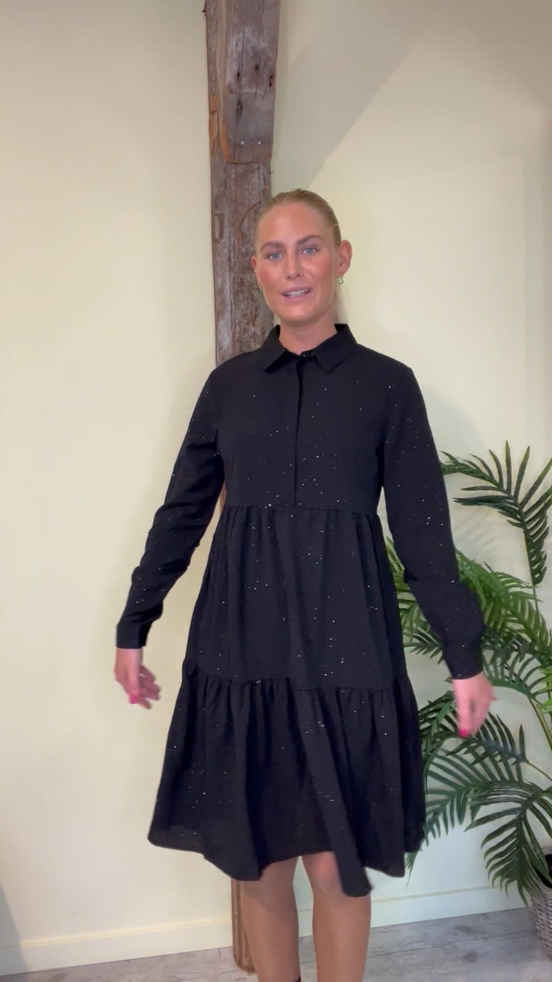 En kjole i sort med glimmer effekt fra JDY er kommet her til vinterperioden. Den er løs i pasformen og lukkes ved brystet med en skjult knaplukning. Ærmerne lukkes i bunden med en knap og den er helt klassisk i halsen med en skjortekrave. Den findes også i grøn.
