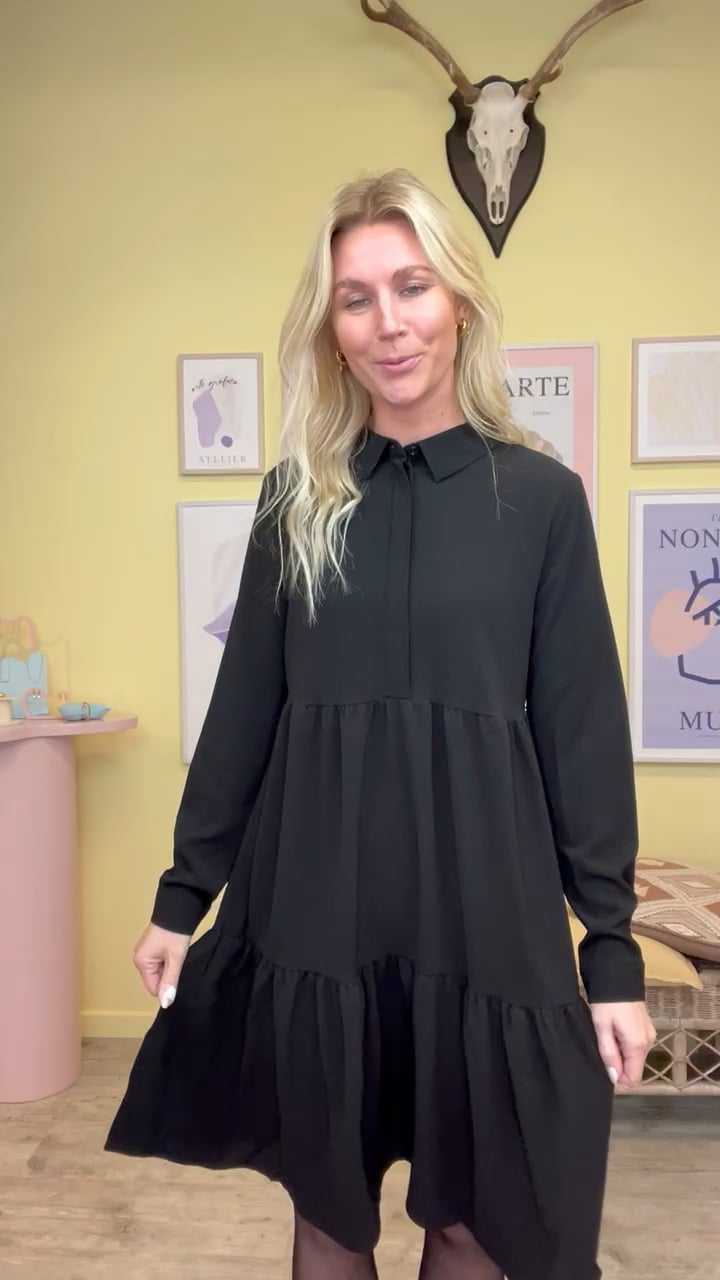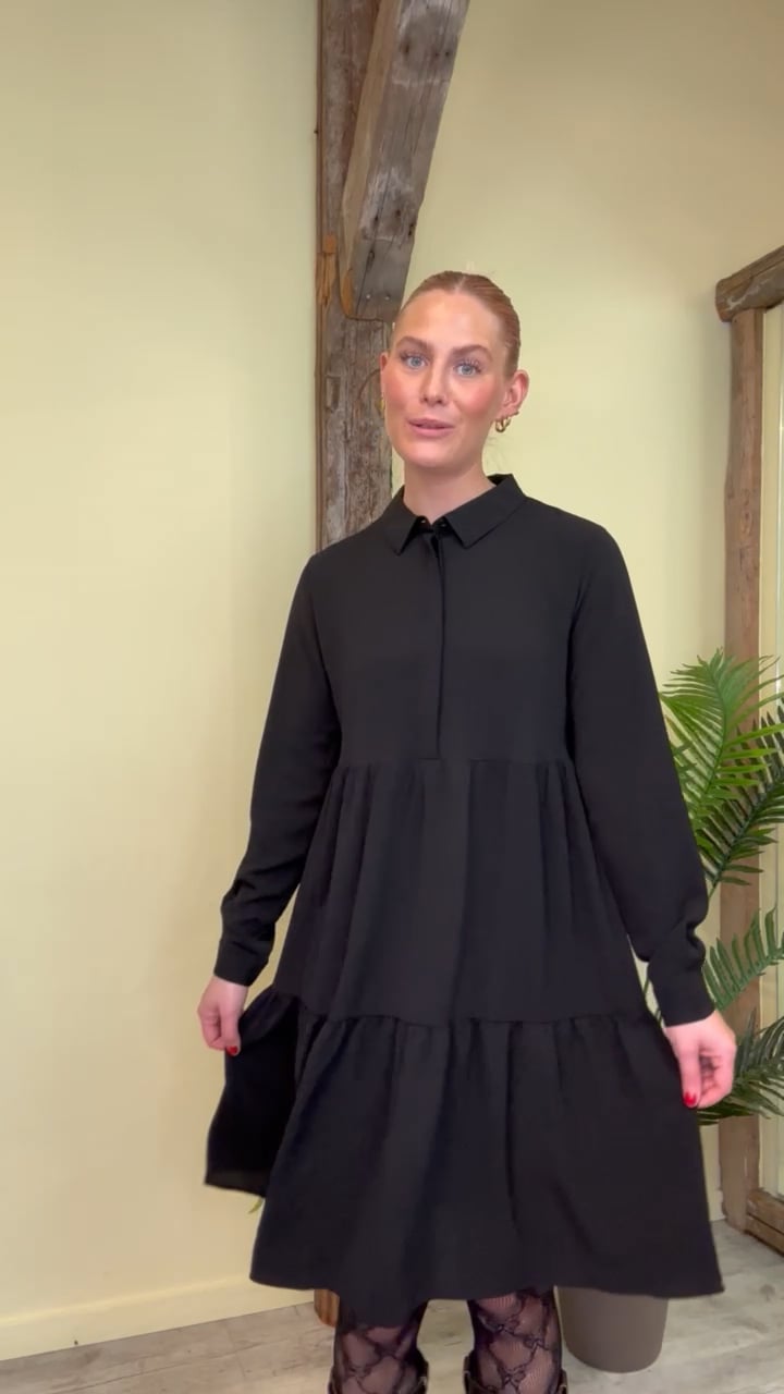 Den kendte Piper kjole model fra JDY er kommet i en klassisk sort farve. Den er som altid løs i pasformen og har knaplukning ned til lige under brystet foran. Knaplukningen er skjult og afsluttes i halsen med en klassisk skjortekrave. Kvaliteten er dejlig let og perfekt til at bruge i hverdagen med et par strømperbukser og en høj støvle.