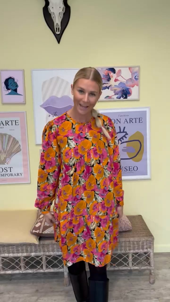 Vi elsker virkelig de smukke efterårsfarver der lander på shoppen. Kjolen her har en sort baggrund med det flotteste blomsterprint i orange, grønne og pinke nuancer der giver en rigtig dejlig efterårsfornemmelse. Kjolen har et løst snit med rund hals der lukkes med knaplukning i nakken. En perfekt hverdagskjole efter vores mening.