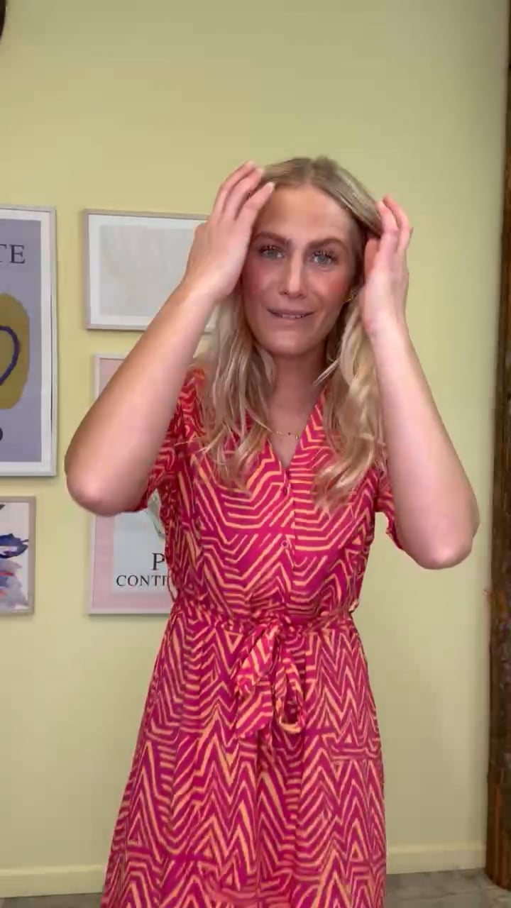 Denne kjole er i en dejlig let kvalitet fra JDY. Den er med A snit i bunden og har et bindebånd i taljen som nemt kan tages af. Derudover er den V halset som afsluttes med en knaplukning der kun går til taljen. Brug den gerne sammen med en strik eller et par sandal til sommer.