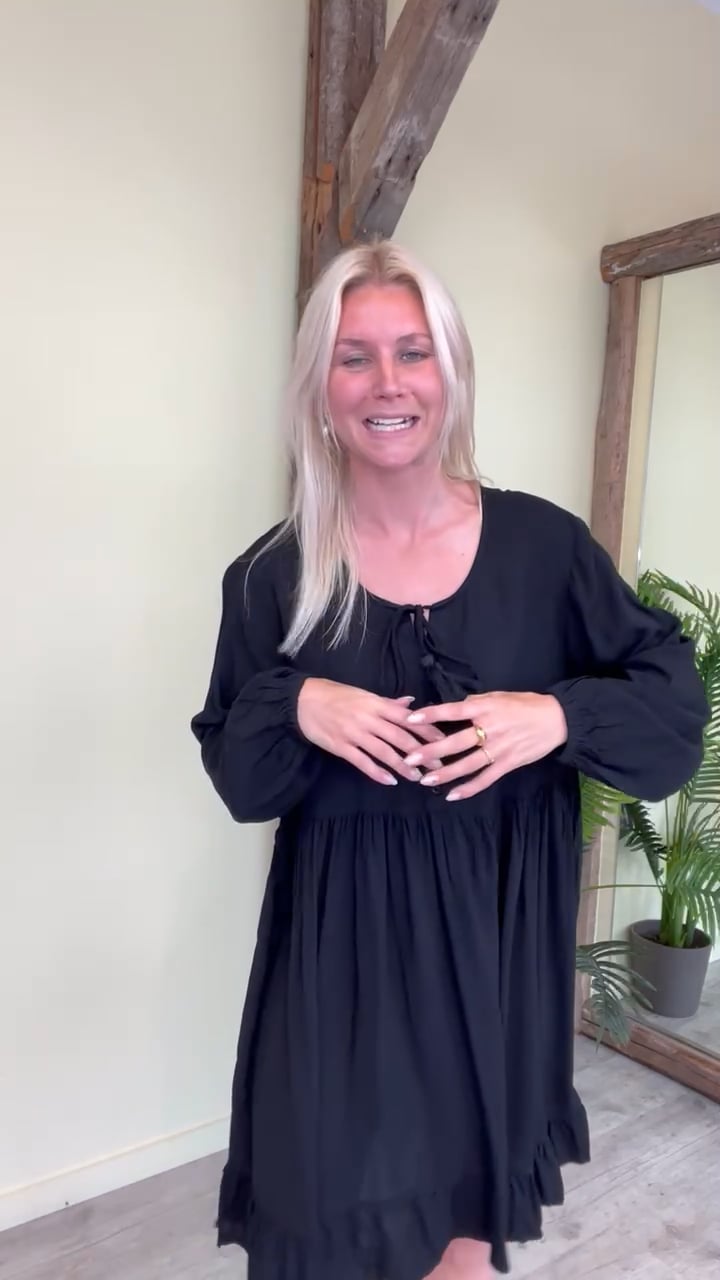 En sød og nem kjole fra JDY er kommet i en klassisk sort farve. Den er løs i pasformen og kan nemt bruges her til sommer både til hverdag og fest. Den er med knapper foran og der kan dannes en lille sløjfe foran. Den er med lange ærmer som afsluttes med en elastikkant. Derudover findes den også i leo print.