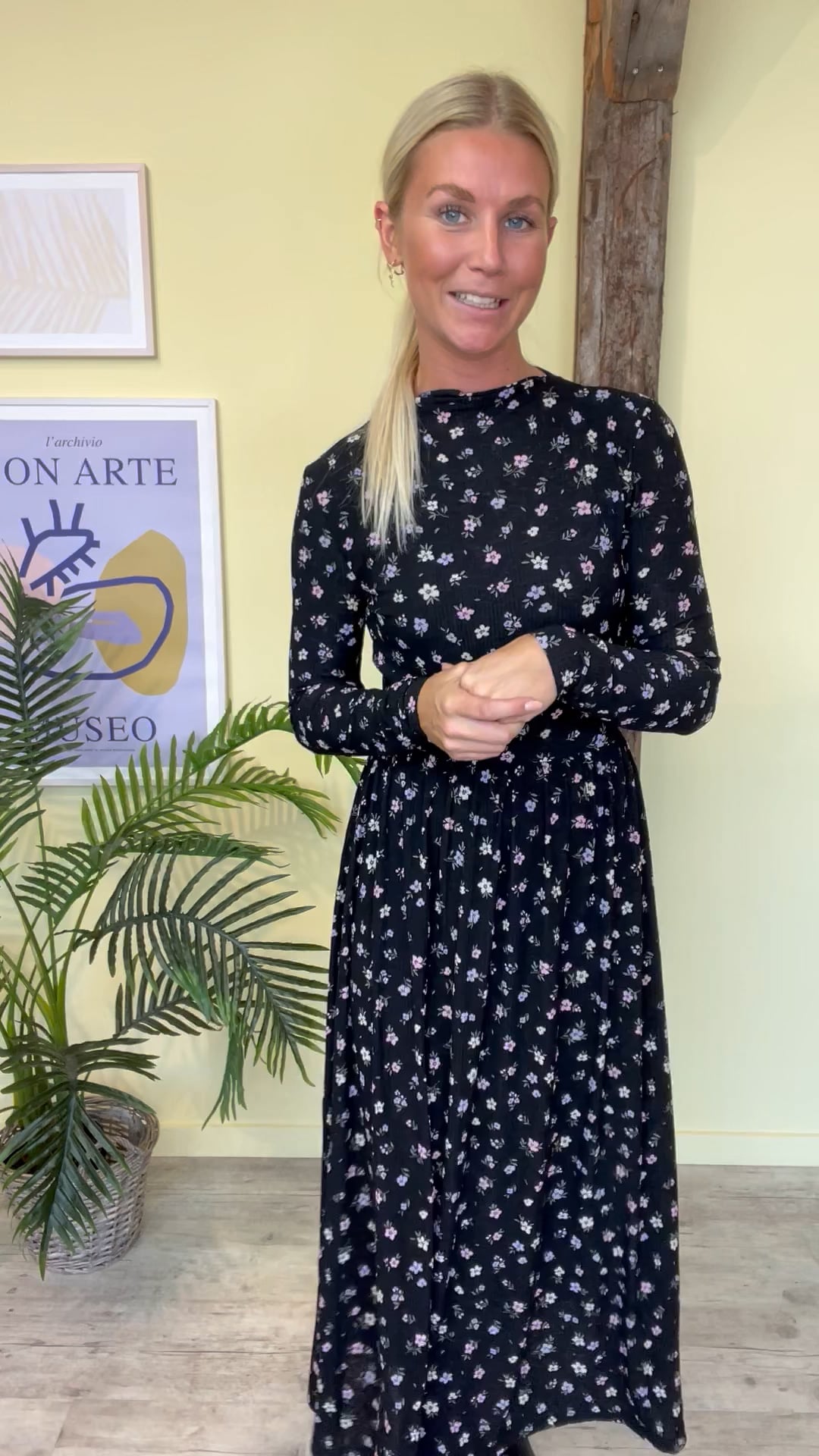 En rigtig forårskjole fra JDY med navy baggrund og små blomster i lilla, rosa og grønne nuancer. Kjolen er gulvlang med lange ærmer og elastik i taljen der giver en smuk pasform og er utrolig at have på i den bløde kvalitet. Style en sandal eller støvle til.