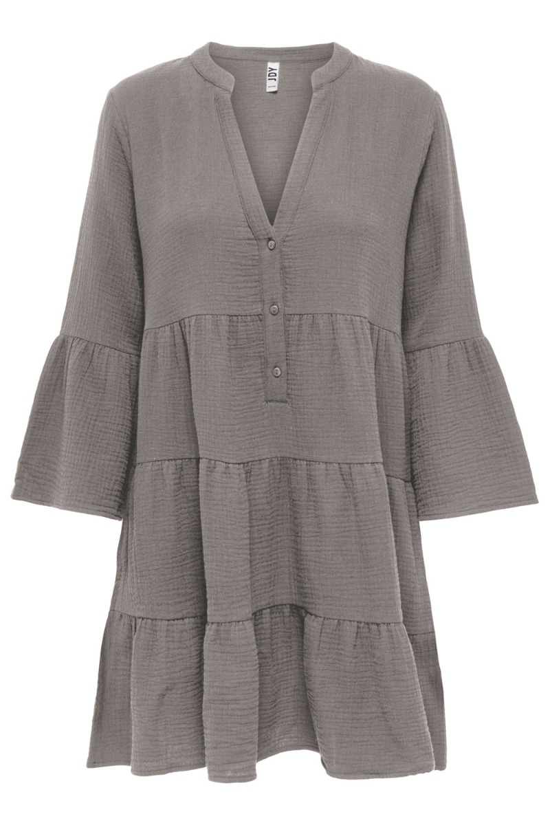 Fin kjole i en neutral jord farve fra JDY. Kjolen er med V-hals og 3/4 lange ærmer, som lige er en anelse åbne og giver et feminint touch til modellen. Derudover er den med tre lags peplum effekt - god til at have udover badedragten eller bare som en let sommerkjole.
