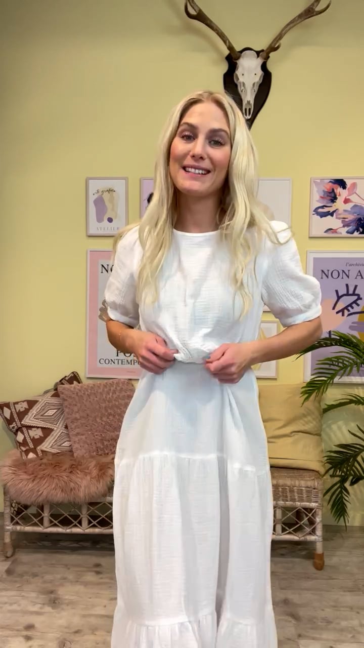 Sød rummelig kjole fra JDY i hvid. Kjolen er lavet i en blød behagelig kvalitet med peplum. Den runde udskæring lukkes bagtil og giver en sød åbning. Kjolen har korte pufærmer og er perfekt til de varme forårsdag og sommerdage.