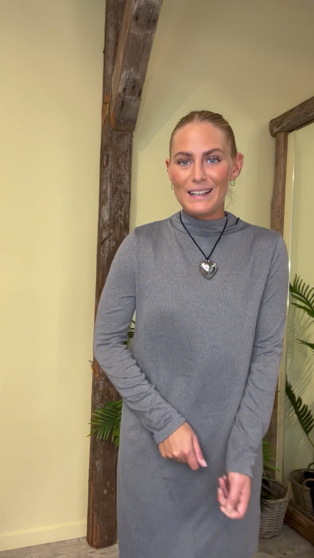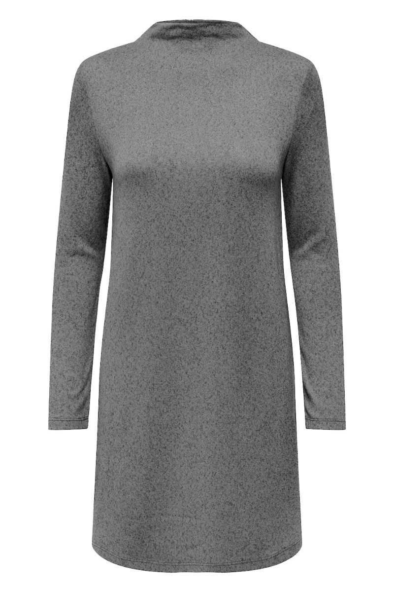 Den blødeste kjole fra JDY er kommet i en fin grå farve. Kjolen findes i flere farver så du kan købe en til hver en lejlighed. Den er smuk sammen med et par strømpebukser med mønster og den er en smule turtleneck effekt i halsen.