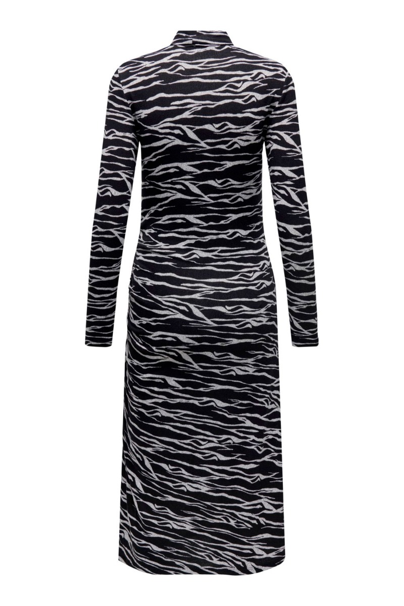 Lang kjole fra JDY i sort/grå zebra print. Kjolen har et længere udtryk med slids i den ene side som er med rynkeeffekt. Den har lange tætte ærmer og rund kinakrave. Kjolen er designet i den blødeste kvalitet.
