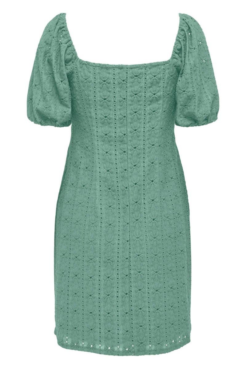 Den sødeste lille kjole fra JDY i grøn blonde kvalitet. Modellen er med pufærmer og har en hjerteformet snit ved halsen. Derudover er der for i, så den selvfølgelig ikke er gennemsigtig. Kjolen er et perfekt valg her til foråret og sommeren.