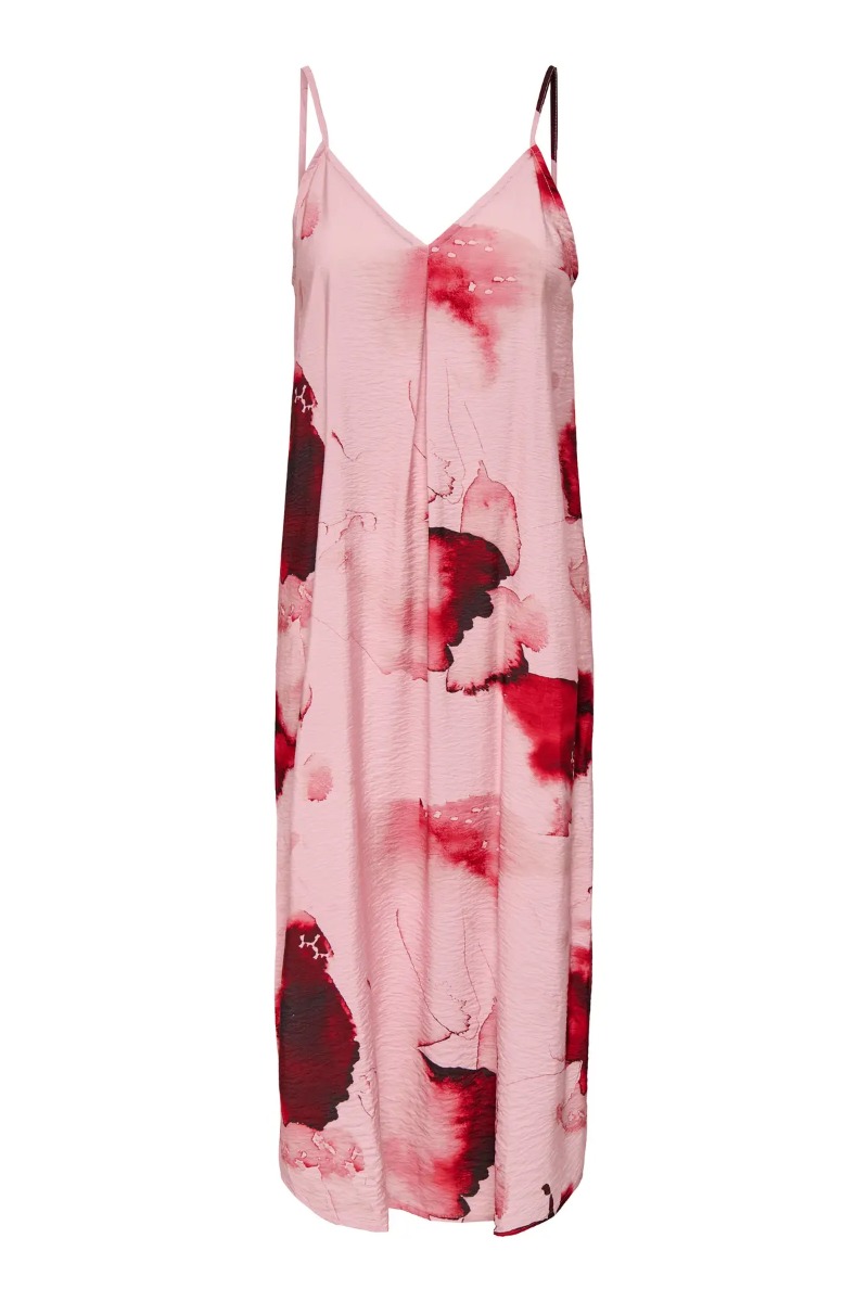 En smuk kjole i et skønt rosa print fra JDy er kommet til en god pris. Den er med tynde spaghetti stropper og perfekt til dette års fest med en sandal eller en stilet. Den er i en let kvalitet og derfor heller ikke varm at have på hele dagen.