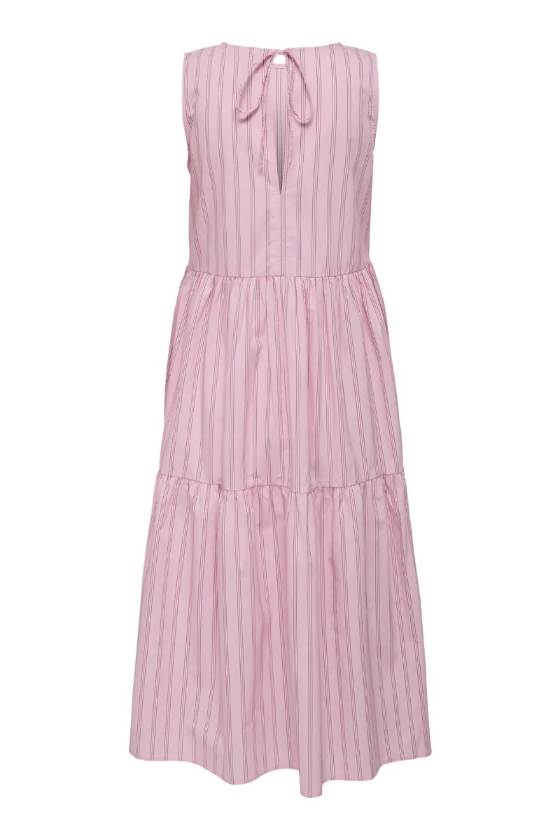 En fin kjole fra JDY er kommet til denne sæson. Den er i rosa og med striber. Derudover har den peplumeffekt og derfor danner dette løse A snit og den mere tætsiddende overdel. Den er nem til et par sandaler eller en sneak.