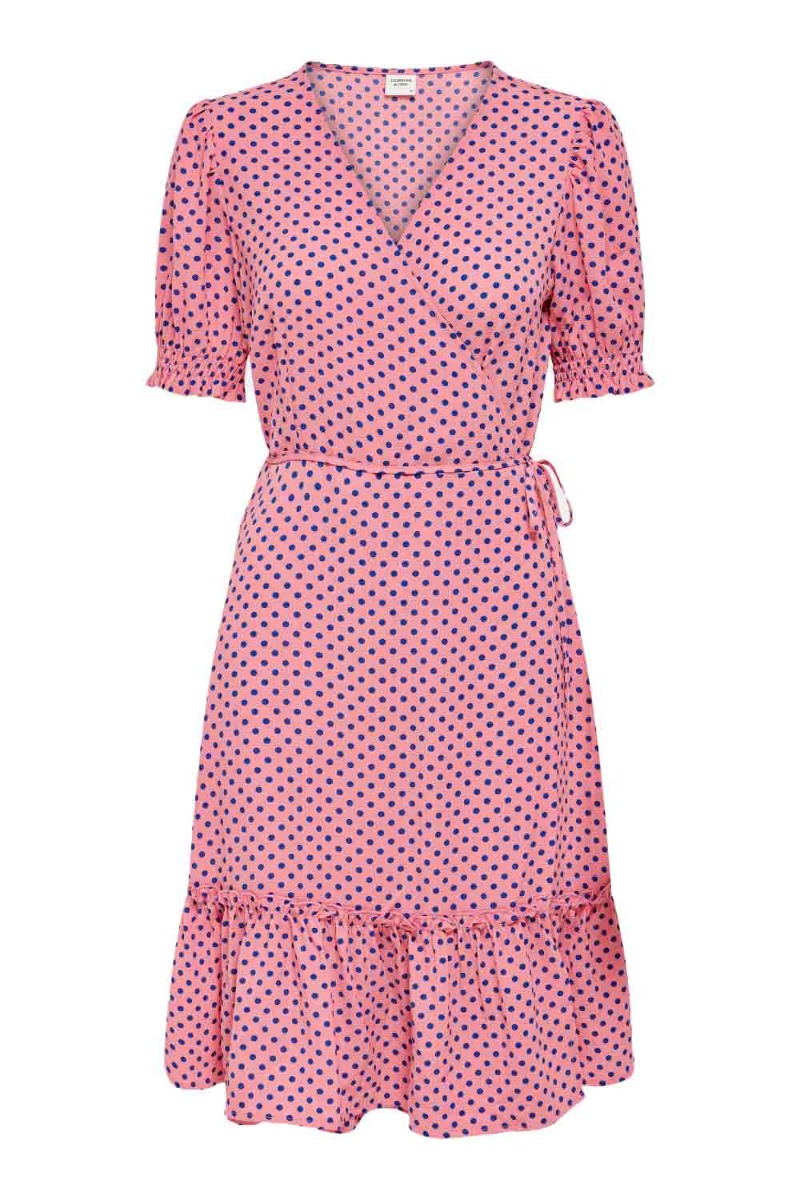 Sød prikket slå-om kjole fra Jacqueline de Yong. Kjolen er pink med små blå prikker og lukkes i siden med snøre, der giver en smuk v-udskæring. Modellen er lettere tætsiddende og falder flot langs kroppen med små pufærmer. Brug den til de varme sommerdage med en sandal.