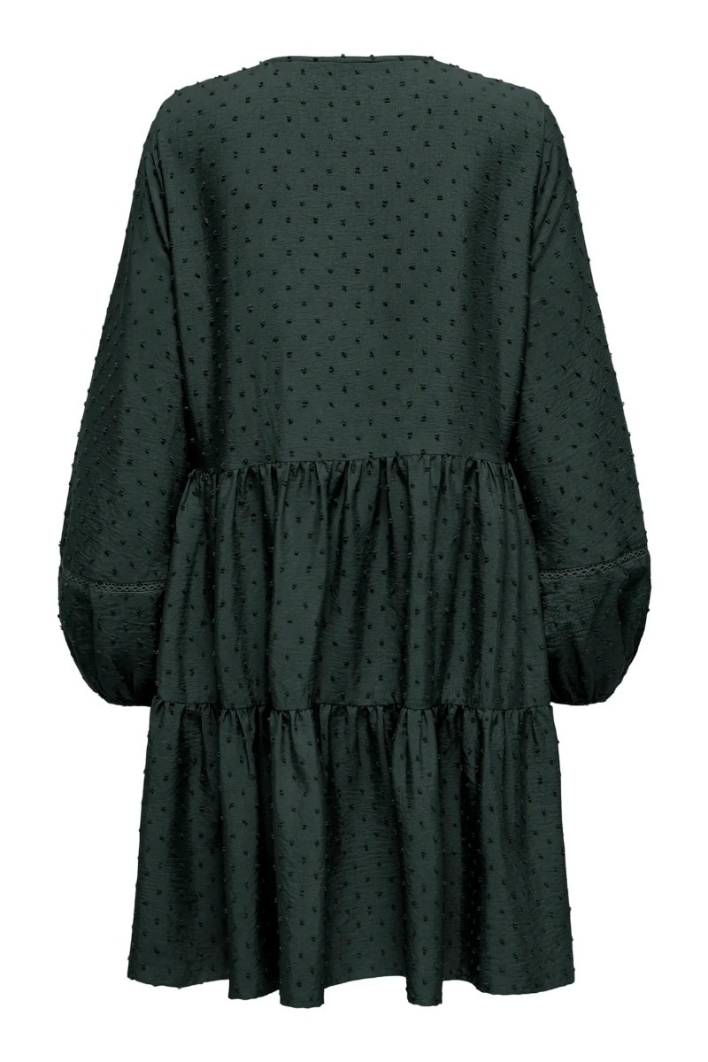 Denne kjole er i en mørkegrøn nuance med en let struktureret overflade og små prikdetaljer, som giver et elegant udtryk. Den har rund hals med fine bindebånd foran, der tilfører et feminint touch. Pasformen er løs og komfortabel med en skæring i taljen, som giver kjolen et let fald. Skørtet er lavet i lag, så det får mere fylde og bevægelse. De lange ærmer afsluttes med elastik ved håndleddene og giver en blød, voluminøs form.