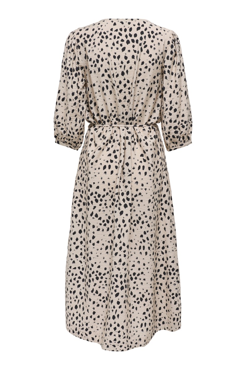 Fin kjole fra JDY. Denne kjole har et enkelt design med en lys baggrundsfarve og sorte pletter. Kjolen har bindebånd i taljen samt v-udskæring. Ærmerne er 3/4 og kjolen har en behagelig og luftig kvalitet. En kjole som er nem at bruge til hverdag, men bestemt også til en sommerfest eller fødselsdag fx.