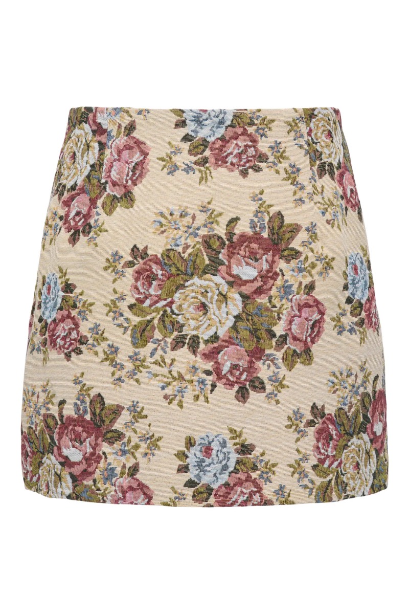 Denne nederdel har et feminint og klassisk vintage-look med et smukt blomsterprint i varme, afdæmpede nuancer. Den er lavet i et kraftigere, vævet materiale med en let struktureret overflade, som giver et eksklusivt udtryk og gør, at den holder faconen flot. Modellen er kort og tætsiddende med en enkel, ren linje, der fremhæver figuren uden for mange detaljer. Blomsterne i rosa, rød, blå og grøn står flot mod den lyse bundfarve og gør nederdelen nem at style med både en enkel strik, en skjorte eller en basic top. Den fungerer perfekt til både hverdag med sneakers og en denimjakke, men kan også nemt dresses op med støvler og en blazer for et mere elegant look.