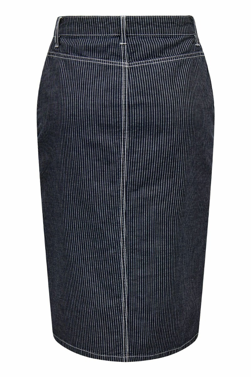 En MUST-HAVE nederdel fra JDY i den flotteste navy farve med nålestribet mønster. Nederdelen har en mellem længde med slids foran og er fast i livet. Den er super cool at style til alle anledninger og er sådan en du bare kan bruge år efter år med både en top og strik alt efter vejr.