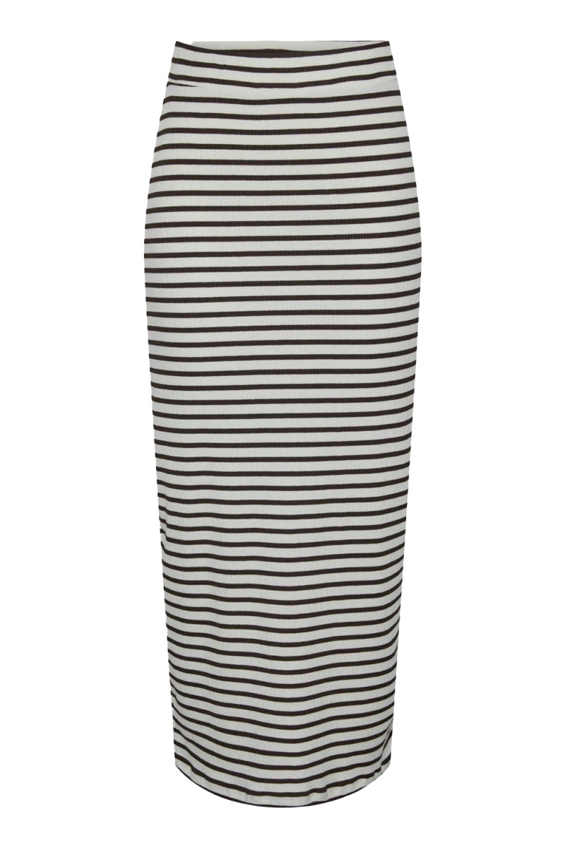 Stribet nederdel fra JDY i et lækkert strækbart materiale. Nederdelen er en længere model og har en slids i den ene side. Den er hvid med mørkeblå striber og har et fast stykke elastik i taljen.