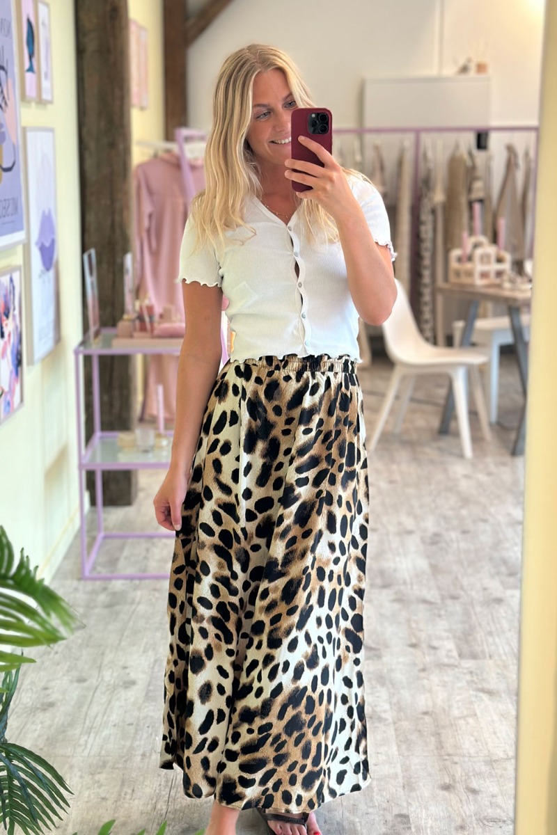 En fin nederdel fra JDY er kommet i det populærer leo print. Den er emd elastik i taljen som danner dette paperbag look i toppen. Den er emd A snit og derfor også løs i pasformen. Den er fin til en t-shirt og den findes faktisk også i sort.