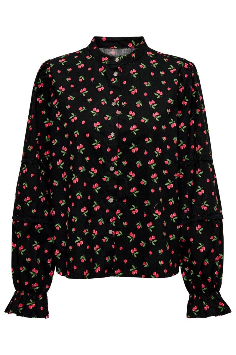 Sødeste skjorte fra JDY med sort bundfarve og et fint lille kirsebær print i røde og grønne farver. Skjorten har lange ærmer der er designet med små blondedetaljer og afsluttes med en flæsekant ved håndleddet. Foran lukkes skjorten med smukke blomster lignende sten der giver et feminint udtryk. Style den med bukser eller nederdel.
