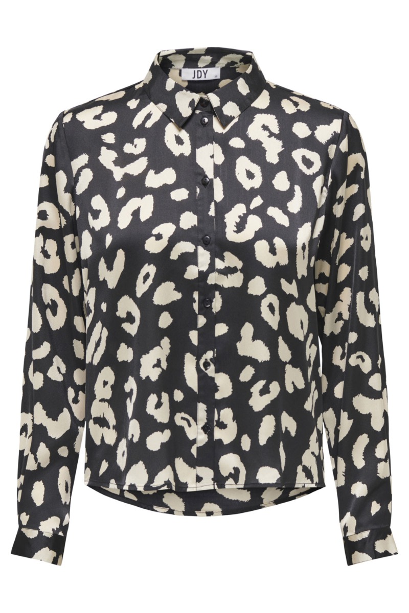 Fin enkel skjorte fra JDY i et klassisk feminint snit med knapper foran. Bundfarven er sort med et lyst leoprint. Den har en lille smule shineeffekt i stoffet og lukkes med knaplukning ved håndleddet. Style med en jeans eller pæn buks.
