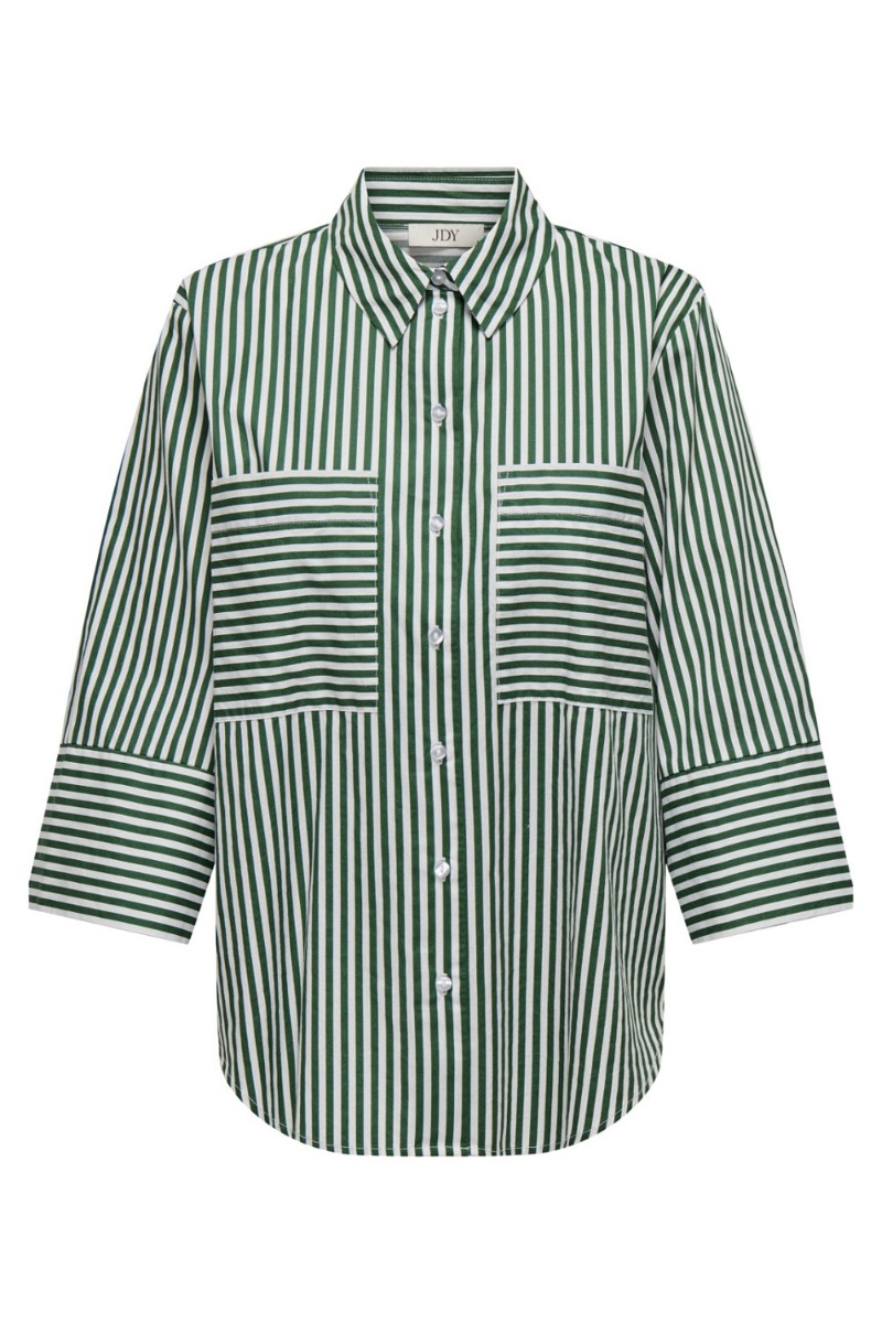 Den fineste skjorte fra JDY i hvid med striber i mørkgrøn farve. Den er løs i pasformen og har 3/4 lange ærmer som er brede med en kant der er vendt så striberne går den modsatte vej. Den har brystlommer i begge sider og klassisk skjortekrave. Brug den gerne til hverdag med et par jeans eller en nederdel.