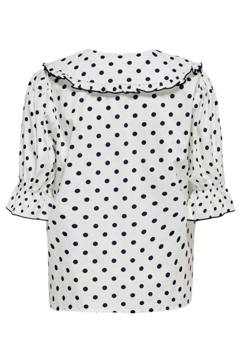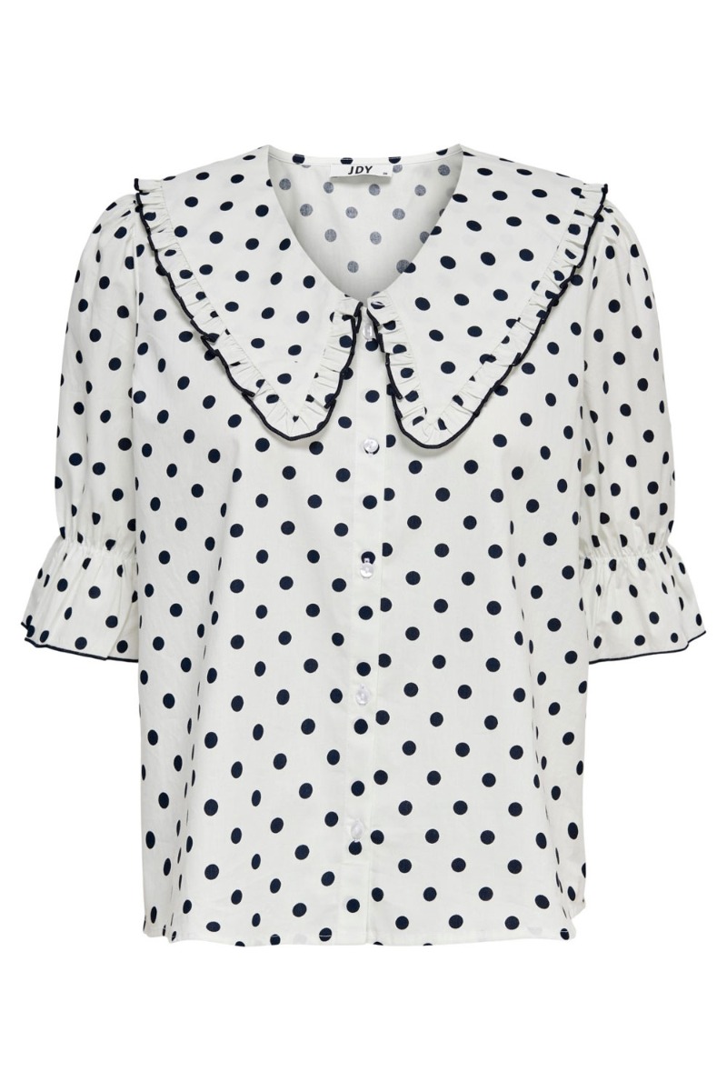 Den sødeste bluse fra JDY. Den er hvid med mørkeblå prikker, har en fin blondedetalje på den store krave den har foran. Skjorten har knapper hele vejen ned, så den dermed også er ammevenlig. Style den super søde skjorte fra JDY med et par fine shorts eller en nederdel og fuldend et fint sommerlook.