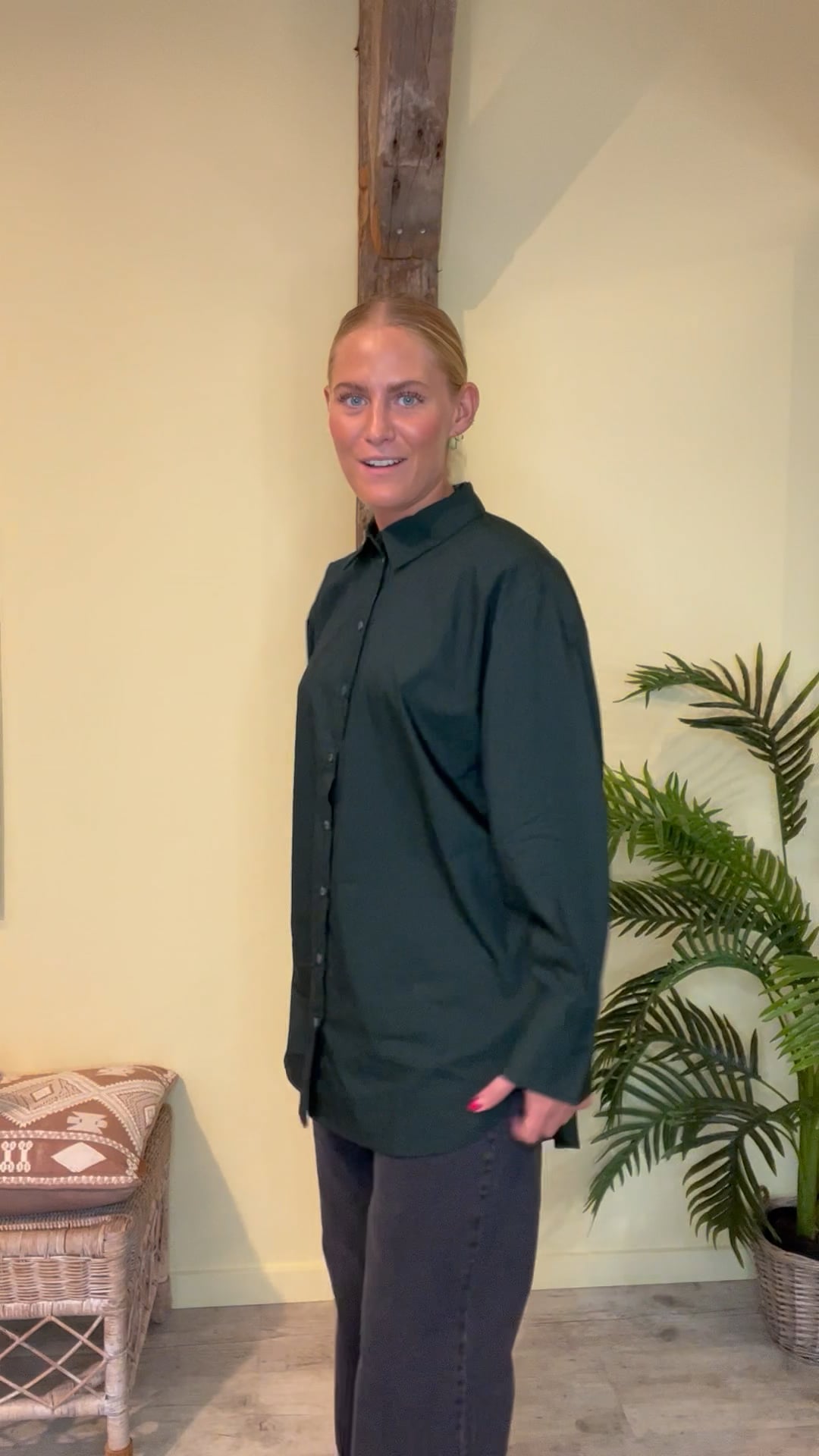 Endnu en Mio skjorte er kommet, men denne gang i en skøn mørkegrøn farve fra JDY. Skjorten er lang i modellen og kan bruges lukket men også åben som en cardigan. Den har synlige knapper og klassisk skjortekrave. Derudover er den lavet i materiale der kræve en let damping inden den skal bruges, så den krøller ikke ret meget.