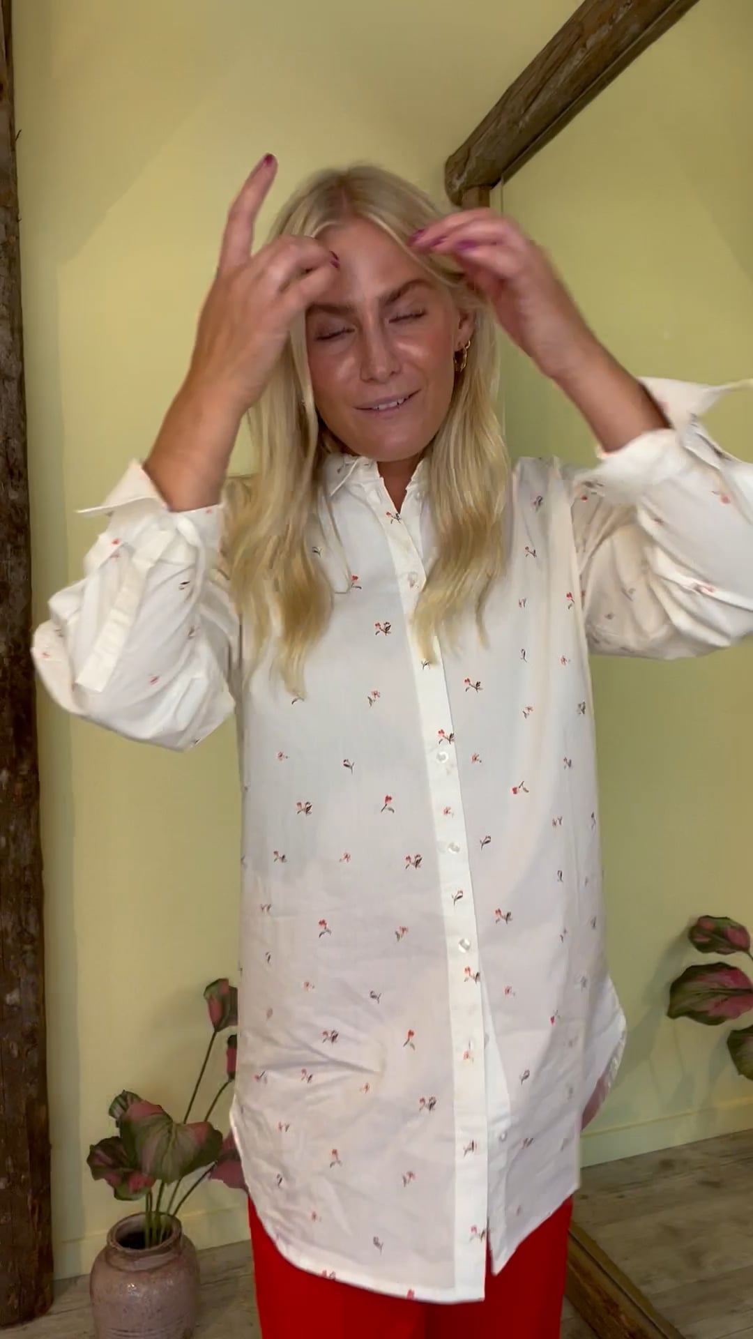 Feminin og fin hvid skjorte fra JDY. En klassisk skjorte med fine små rød/orange/lyserøde blomster. Den lukkes ned foran og ved håndledene med fine knapper. Har et løssiddende snit så den passer super i kuffteren til ferien eller i hverdagsgarderoben. Style den med et par flotte jeans eller en fin nederdel