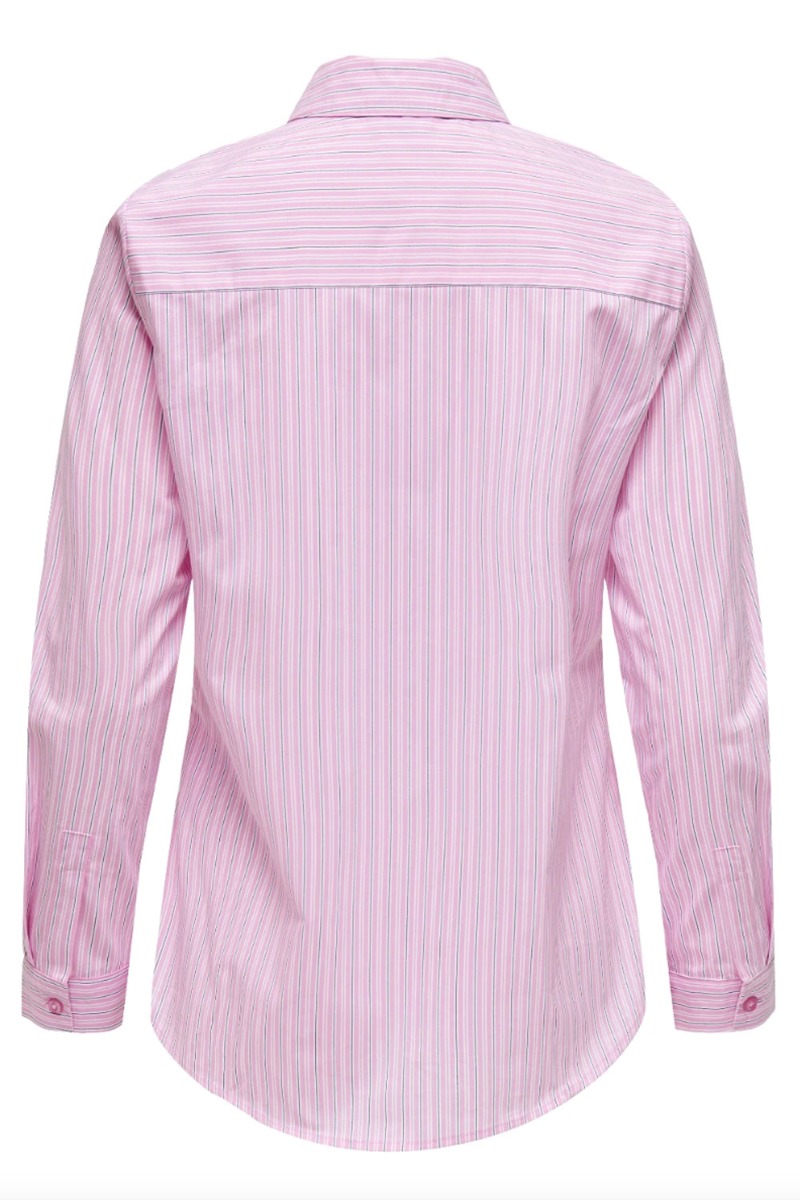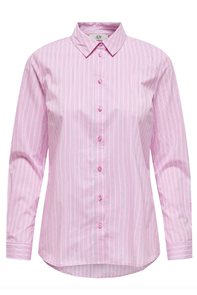 Den velkendte og populære skjorte "Mio" fra JDY, i en super fin lyserød farve med en tynd navyblå og hvid strib. Den er helt normal i størrelsen og har knapper hele vejen ned, som gør den ammevenlig. Er perfekt at style til både jenas og nederdele.