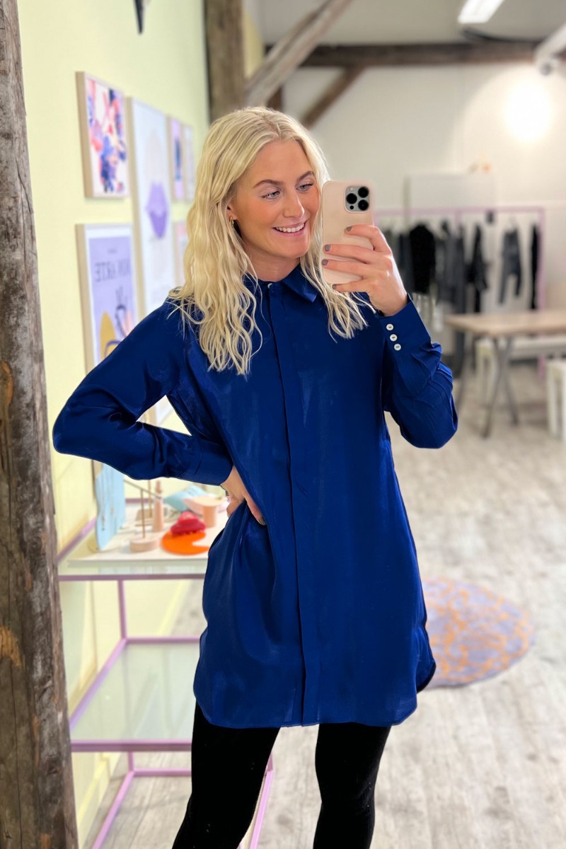 En klassisk blå skjorte i lang model fra JDY. Skjorten har skjult knaplukning og almindelig skjorte krave. Derud over afsluttes ærmerne også med 3 knapper. Skjorten er rundet i bunden både foran og bagved.