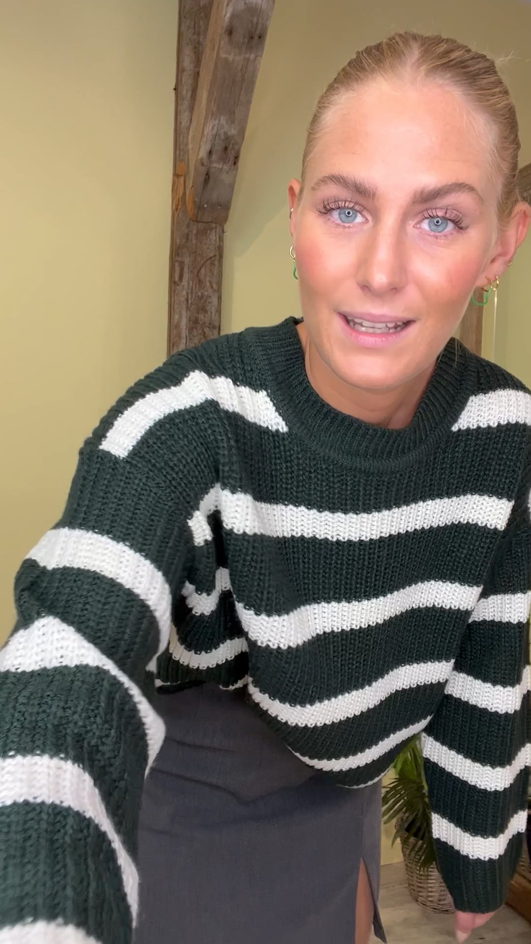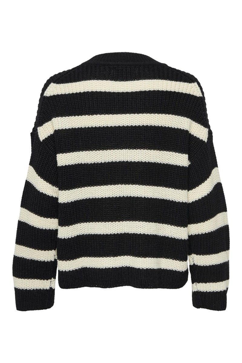 Den skønneste strik er landet fra JDY i en mørk grøn farve med hvide striber. Den er løs i pasformen og har brede lange ærmer. Derudover er den en smule gennemsigtig i strikken og derfor anbefaler vi at du bruger en top under. Den findes også i en smuk pink farve med de samme hvide striiber og fra det samme mærke.