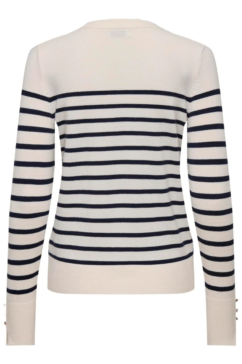 Strikbluse fra JDY. Denne strik har en tynd, men super blød og behagelig kvalitet. Den har ribkant ved hals og fornede, samt manchet-effekt med sten. Strikken har et stribet design, som passer til alle underdele.