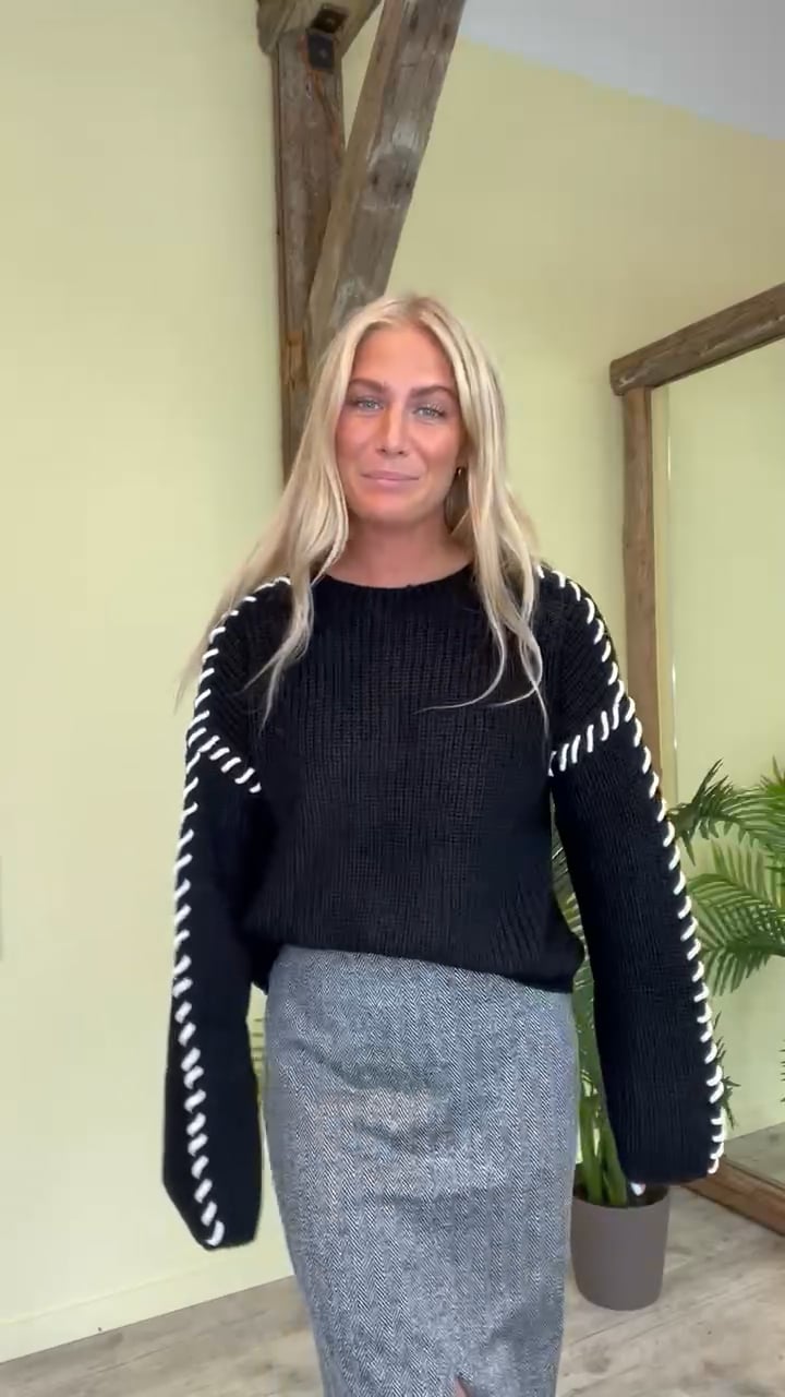 En rigtig lækker strik fra JDY. Strikken er klassisk sort med hvide brede sygninger fra skulderen og ned langs ærmet. Dette giver virkelig et cool udtryk og er en tendens som vi komer til at se meget mere til. Du kan også få strikken i en gråbeige nuance med hvide sygninger.