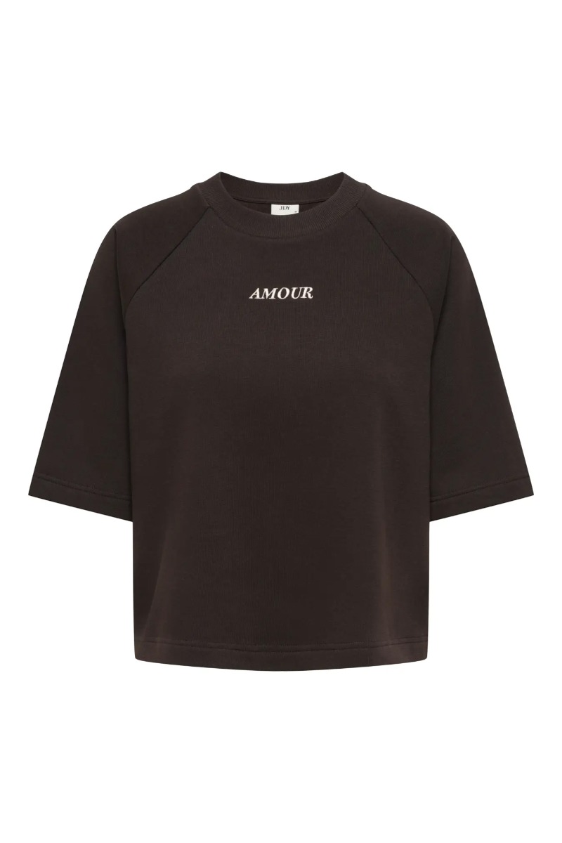 Casual og moderne T-shirt i en dyb brun nuance med et minimalistisk og stilrent udtryk. Den korte, boxy pasform giver et afslappet og moderne look. T-shirten er designet med korte ærmer og rund halsudskæring samt raglanærmer, der giver en flot pasform og et let sporty udtryk. På brystet ses et diskret broderet “AMOUR”-print, som tilføjer en fin og feminin detalje. Den er perfekt til et afslappet hverdagslook og kan nemt styles med jeans, shorts eller en nederdel for et enkelt og moderne outfit.