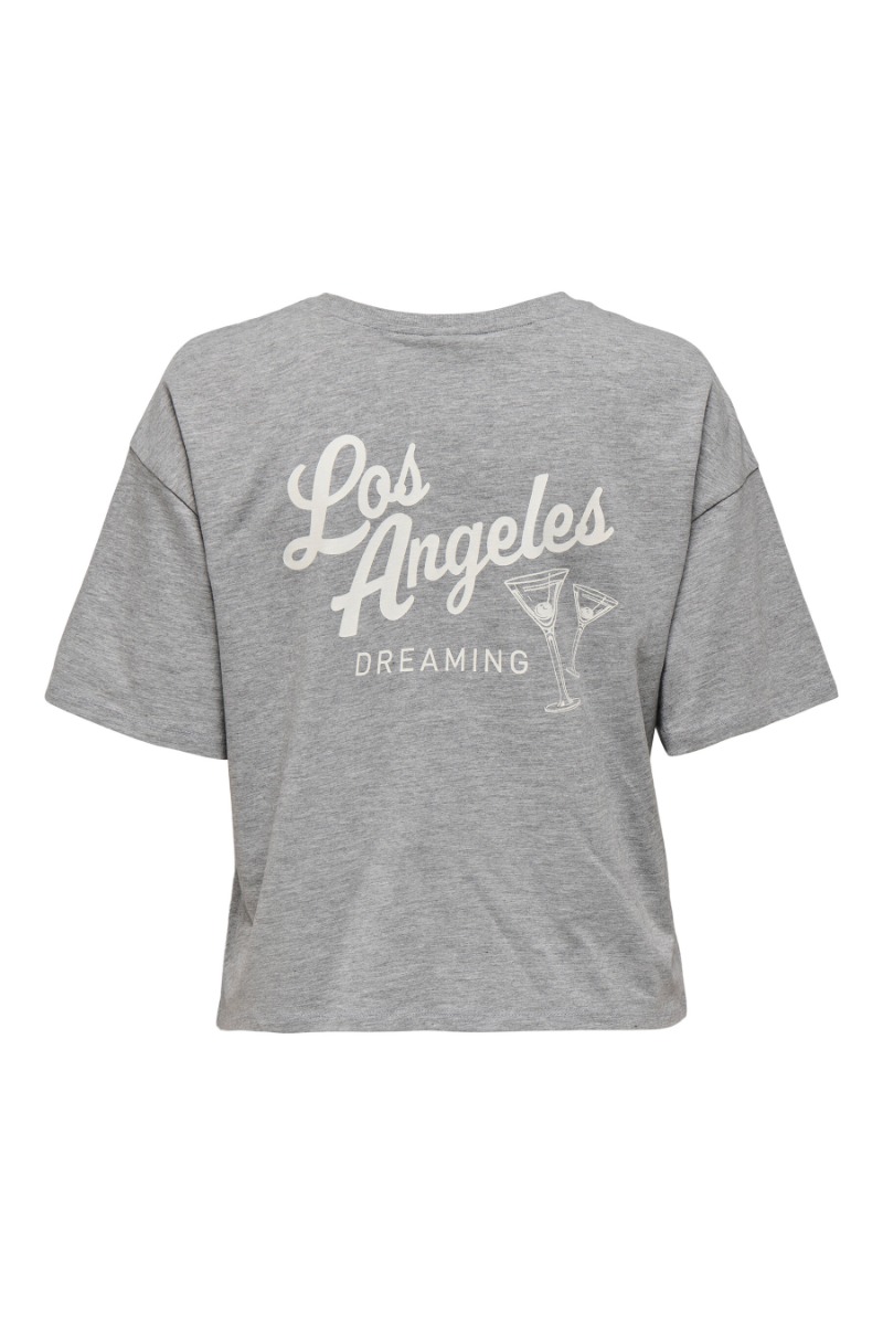 En super fin t-shirt er landet fra JDY i denne grå farve. T-shirten har print både for- og bagpå, hvor der står 'Los Angeles Dreaming'. Den er super cool til et par jeans, og er sådan en t-shirt du altid kan bruge!