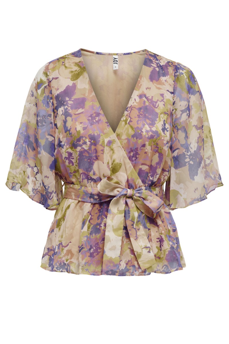 Sød t-shirt fra JDY i et let gennemsigtigt materiale der er foret. T-shirten har løse ærmer med wrap effekt foran og elastik i taljen. Den er beriget med bindebånd der giver en sød detalje og peplumeffekt i bunden. Style den med et par bukser eller jeans.