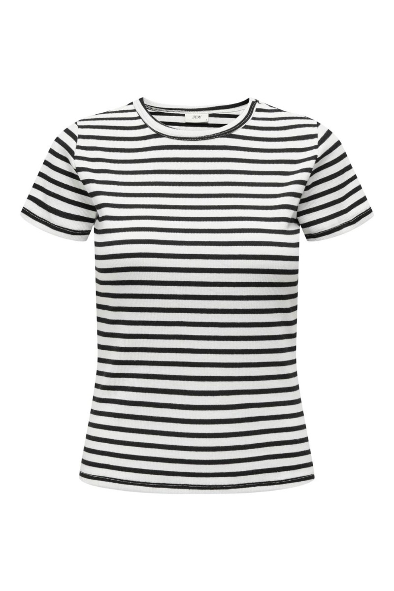 En fin og simple t-shirt fra JDY er kommet med striber i hvid og navy. Den er i en dejlig blød ribkvalitet som er behagelig at have på, hvor t-shirten er tætsiddende uden at stramme. Derudover er den simple model nem at style til både jeans og nederdel og kan bruges hele året rundt.