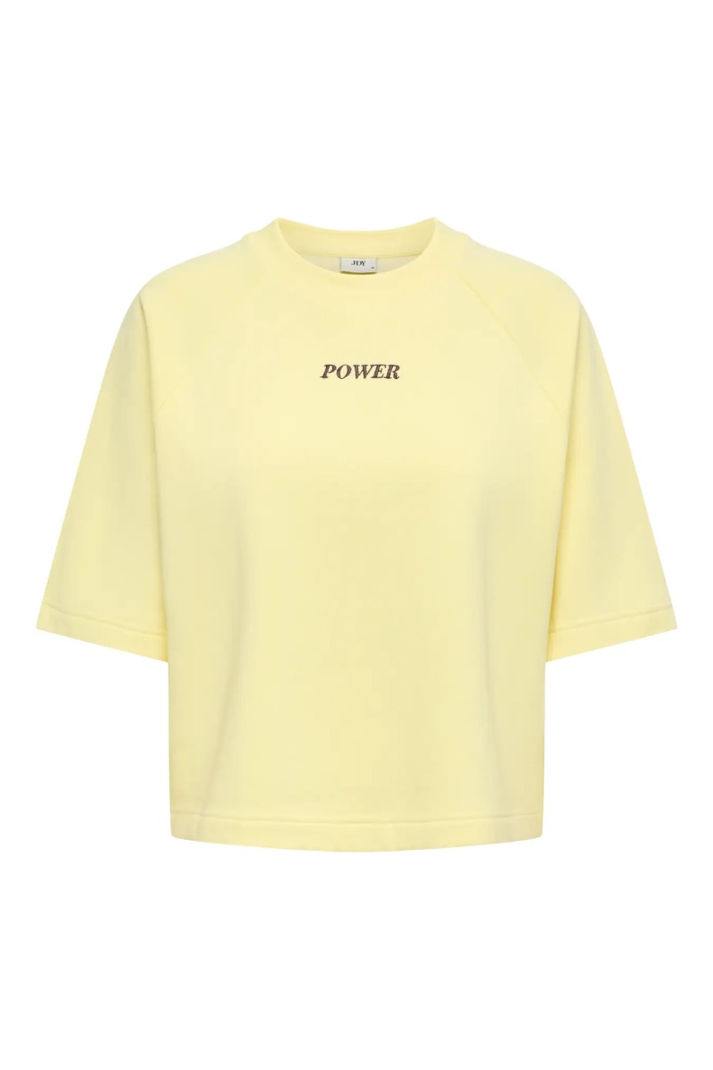 Casual og moderne T-shirt i en lys gul nuance, der giver et friskt og sommerligt udtryk. Den korte, boxy pasform skaber et afslappet og trendy look, som passer perfekt til en moderne garderobe. T-shirten er designet med korte ærmer og rund halsudskæring samt raglanærmer, der giver en flot pasform og et let sporty udtryk. På brystet ses et diskret broderet “POWER”-print, som tilføjer en enkel og stilfuld detalje. Den er ideel til et afslappet hverdagslook og kan nemt styles med jeans, shorts eller en nederdel for et enkelt og moderne outfit.