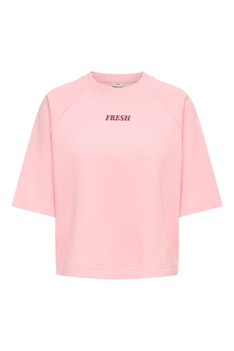 Casual og moderne T-shirt i en blød lyserød nuance, der giver et friskt og feminint udtryk. Den korte, boxy pasform skaber et afslappet og moderne look, som passer perfekt til en alsidig hverdagsgarderobe. T-shirten er designet med korte ærmer og rund halsudskæring samt raglanærmer, der giver en flot pasform og et let sporty udtryk. På brystet ses et diskret broderet “FRESH”-print, som tilfører en enkel og stilfuld detalje. Den er ideel til et afslappet hverdagslook og kan nemt styles med jeans, shorts eller en nederdel for et enkelt og moderne outfit.