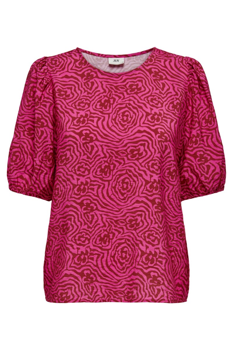 Fin bluse fra JDY i pink med et grafisk rose print. T-shirten har korte ærmer med elastik i enden der skaber et lille volumiøst look. Den er let løs med rund halsudskæring og sød at style med en sort nederdel eller et par jeans alt efter anledning.
