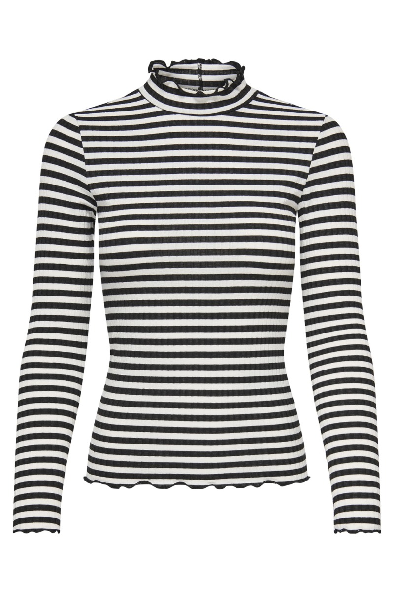 Fransiska modellen er vil altid glade for fra JDY. Den nye model i blusen har en bølget afslutning ved hals, ærmer og bund. Derudover er kvaliteten i en bred rib og striberne går vandret i sort og hvid.