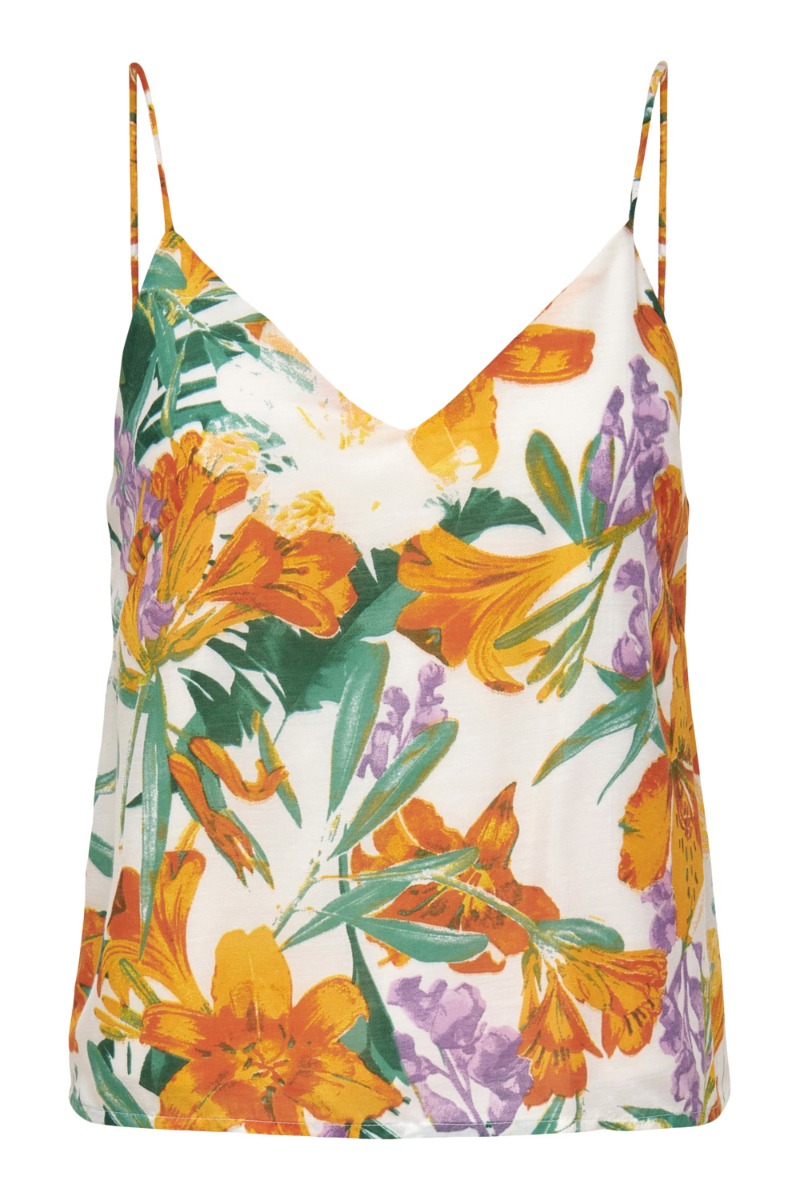 Denne top fra JDY giver en masse sommer-vibe med dens skønne blomsterprint i orange, lilla og grønne farver. Toppen er lavet i en dejlig let kvalitet med tynde justerbare stropper og en diskret lille v-udskæring. Style den med et par shorts eller nederdel.