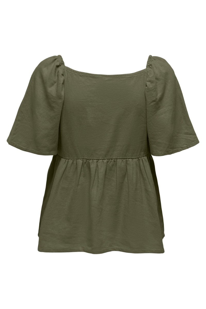 Feminin top fra JDY i hørkvalitet. Toppen har en flot army farve med matchende bukser i samme farve. Den har en firkantet udskæring med peplum detalje i bunden og et lille fint løst ærme.