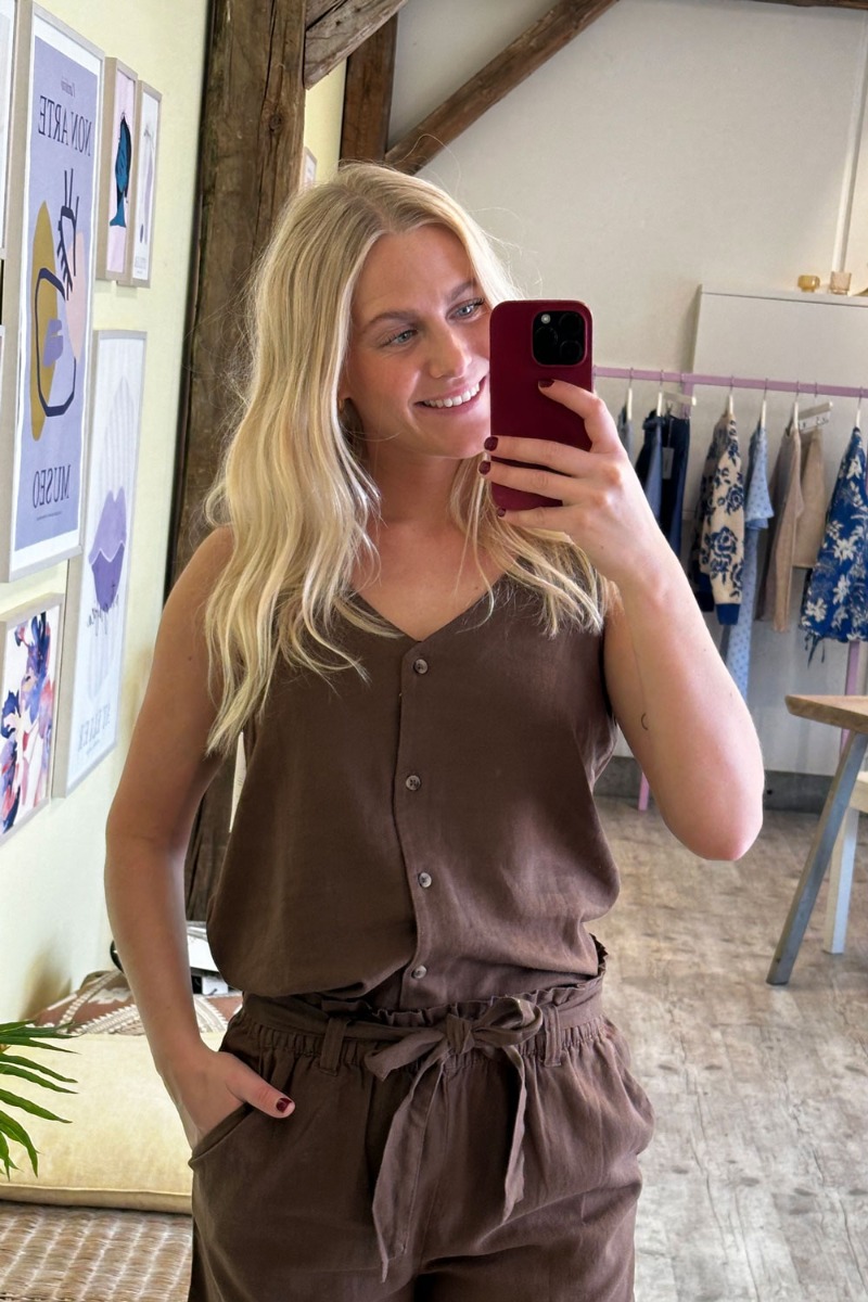 Fin hør top fra JDY i en chokoladebrun farve. Toppen har brune knapper hele vejen ned og går samtidig ned i en v-udskæring. Der findes matchende shorts til, så du kan skabe et helt sæt. Pasformen er løs og den findes i flere forskellige flotte jordfarver.