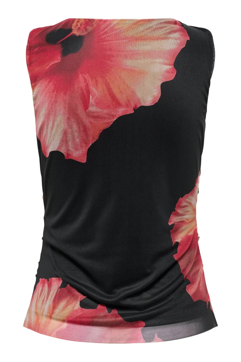 JDY - Top - Lea S/L Mesh Rouching Top JRS EXP - Black Hibiscus Flower (Levering midt april)