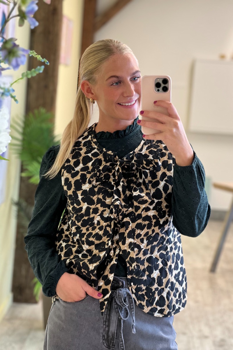 Den smarteste vest i leo fra JDY. Vesten er designet i det velkendte leoprint, som kan styles til sort set det hele. Vesten lukkes med to bånd foran og har et quiltet stof. Kna sagtens bruge både til hverdag evt. med et par jeans eller særlige anledninger ud over en kjole.